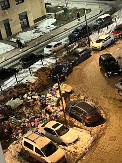 Сзади дома другая беда: полусфер нет, машины втыкаются вдоль дороги, бордюры ломают, а жители с парковки выехать не могут — царапают друг друга.