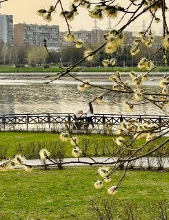 Остатки снега, солнце и цветущее дерево.